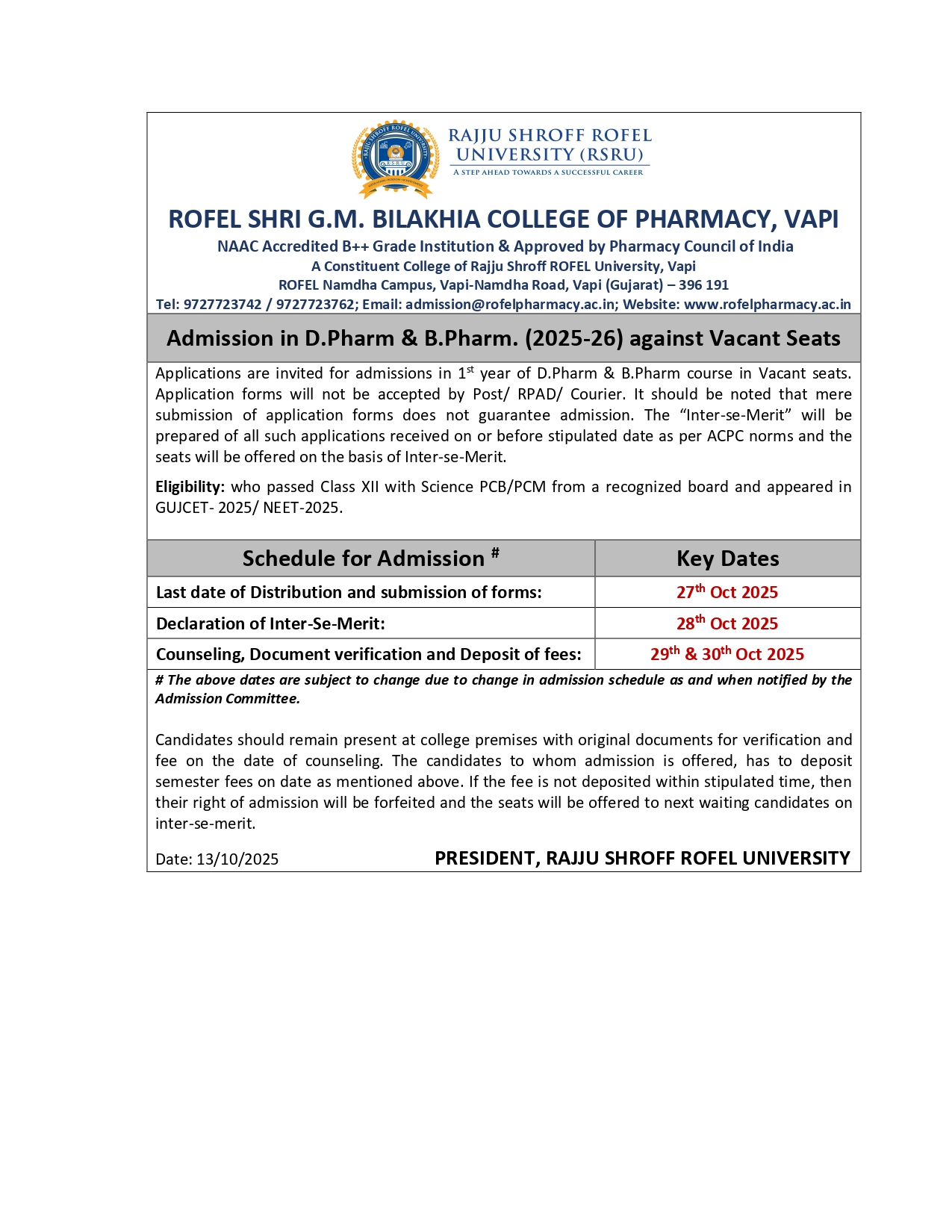 Admission Procedure in Management Quota Seats of B.Pharm Program