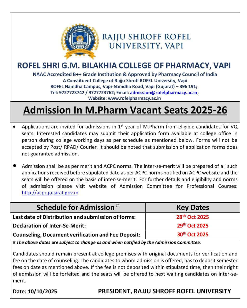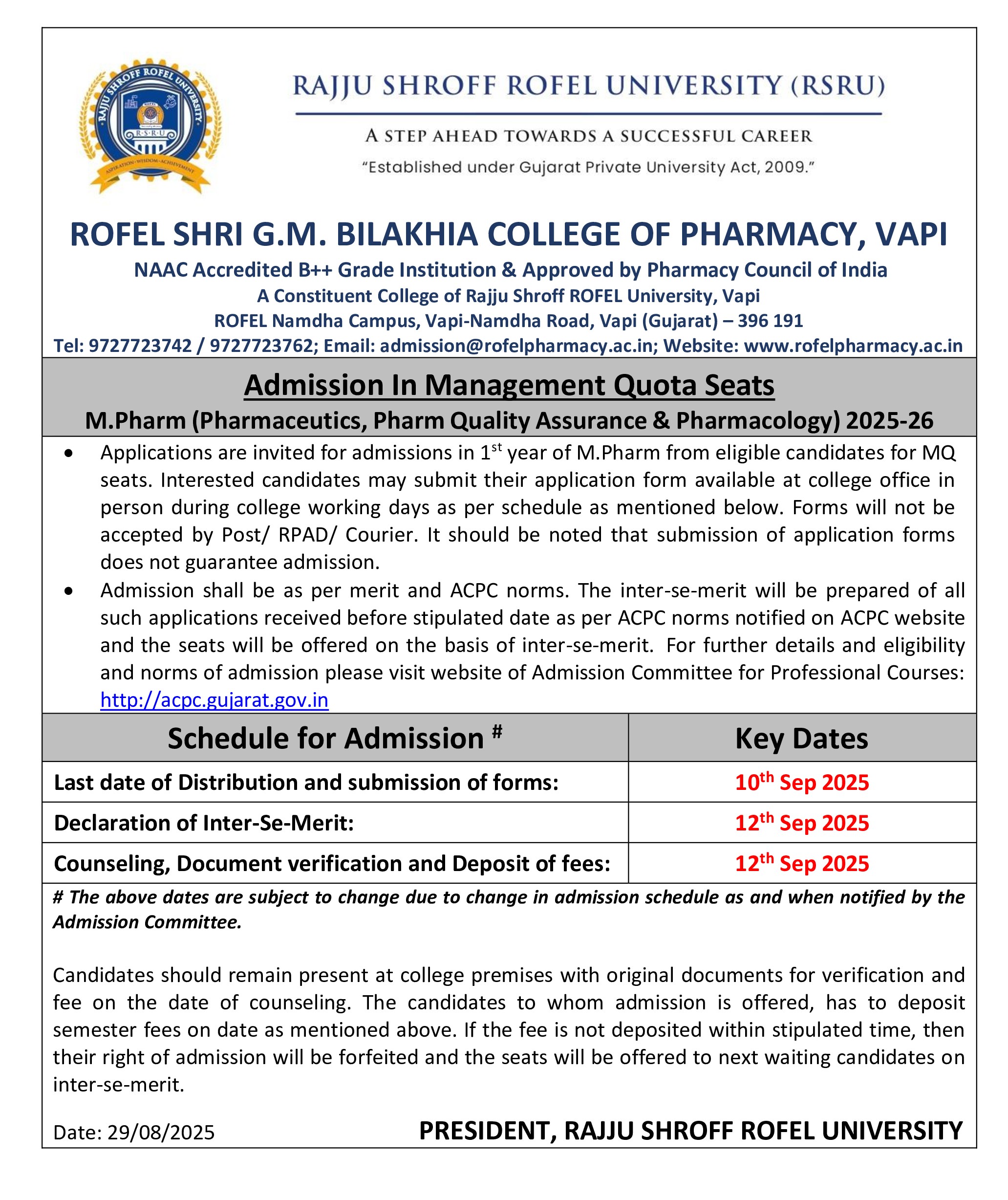 Admission Procedure in Management Quota Seats of M.Pharm Program